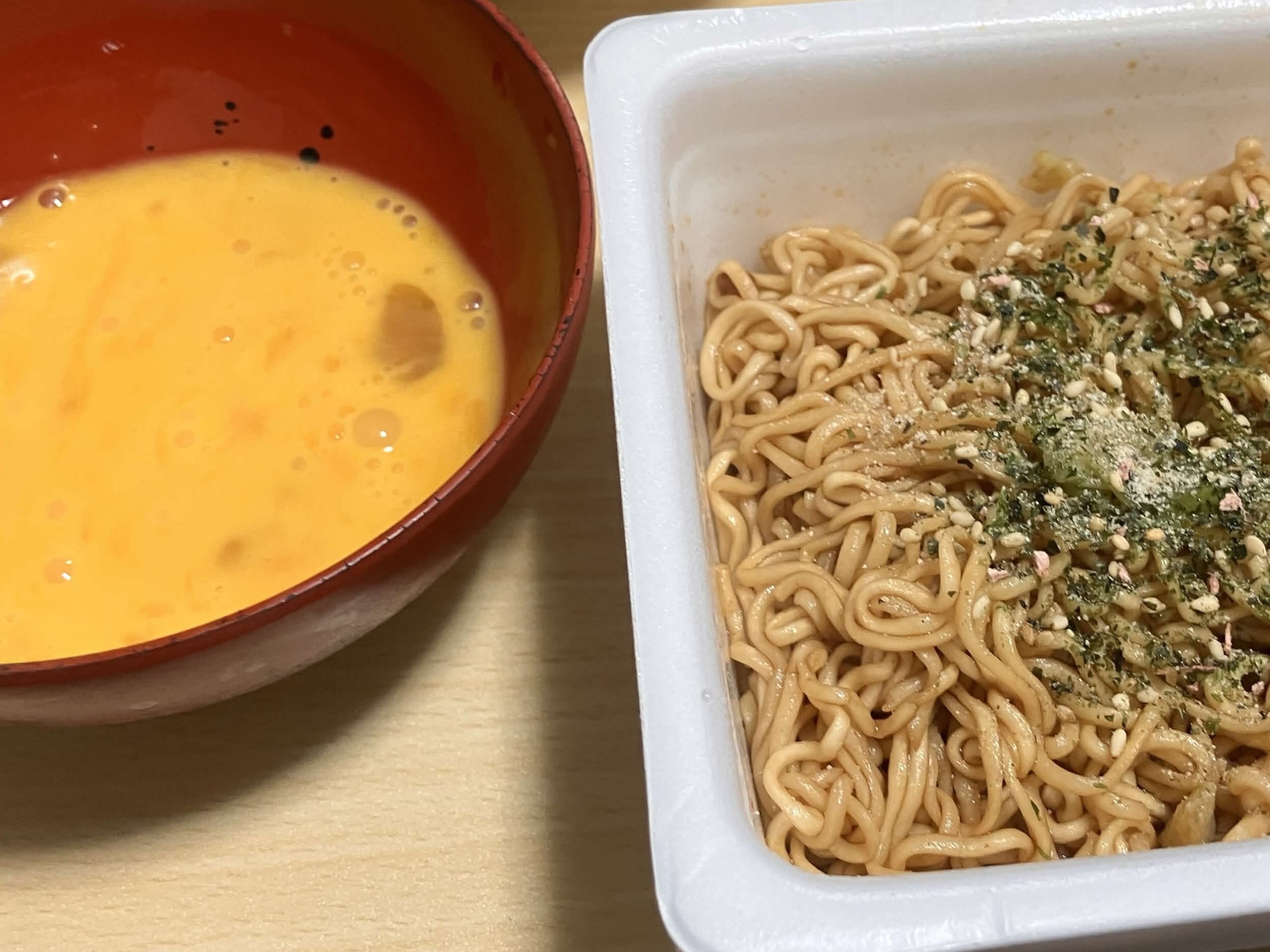 普通にペヤングを作って溶き卵につけて食べるだけ